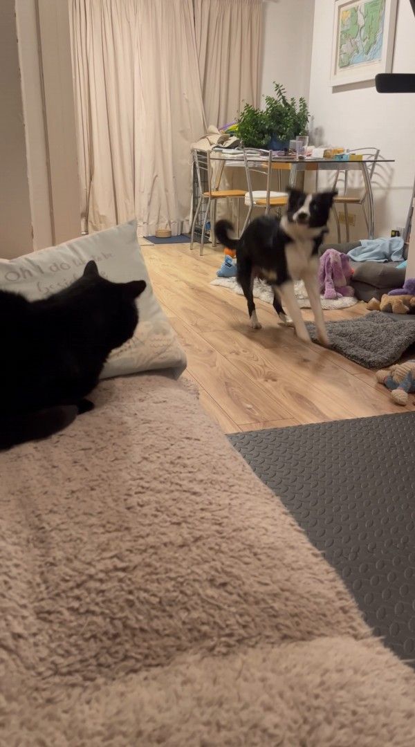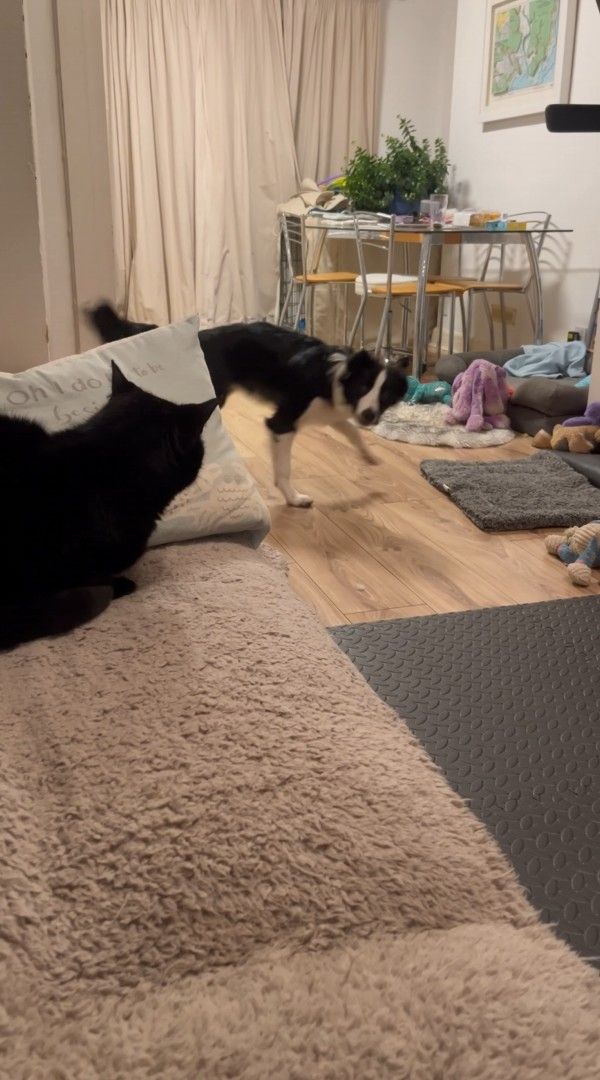 ぴょんぴょん跳ねる元気なボーダーコリーの子犬。この子は、ソファに座る猫に遊んでほしいみたいですが・・