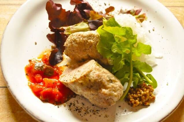 ひき肉にハーブを加えてしっかり練ったらアルミホイルで包んで袋に入れて湯煎し、オリジナルのサルシッチャを作ります。ジャガイモは付け合わせに。2つの組み合わせでボリューム満点の一皿になります。