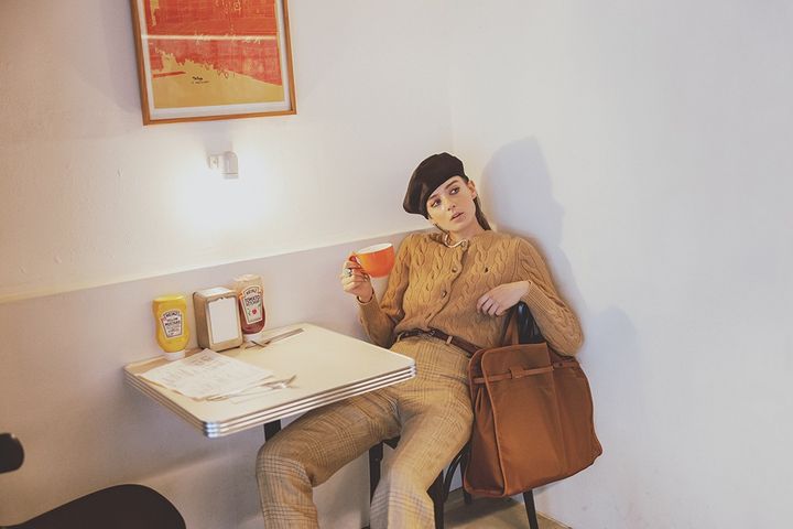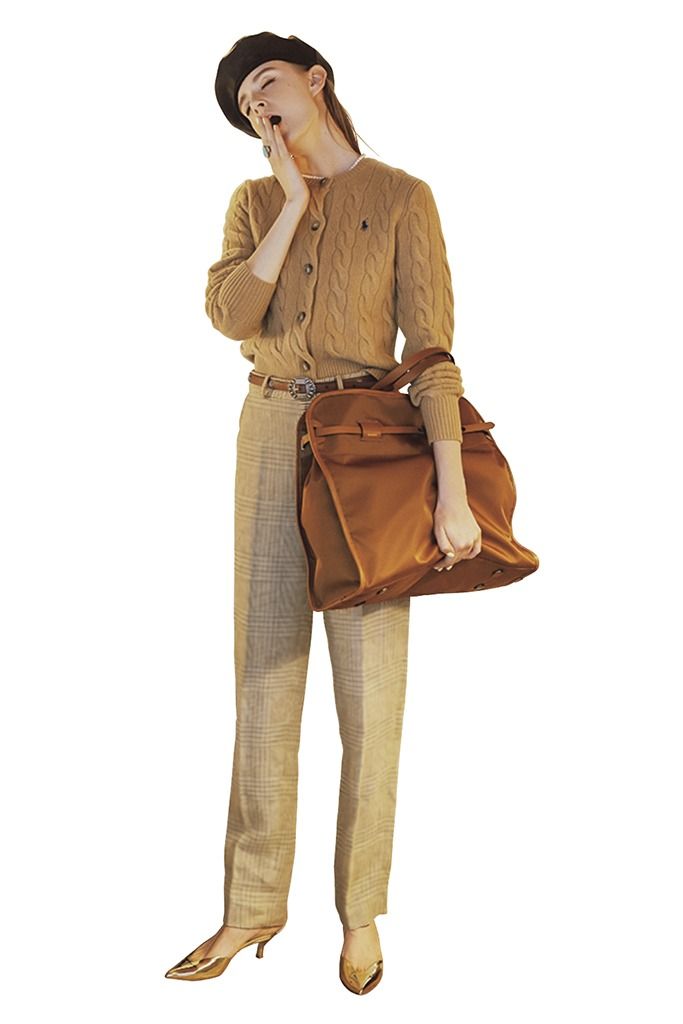 ケーブルニット 35,200円、パンツ 59,400円、ベルト 30,800円/以上ポロ ラルフ ローレン(ラルフ ローレン) ベレー帽 1 7,600円/オーサムニーズ(ジャック・オブ・オール・トレーズ プレスルーム) ネックレス 15,400円/スメリー(センスオブプレイス バイ アーバンリサーチ 天王寺MIO店) リング 11,000円/バナナ・リパブリック バッグ 31,900円/オルセット(オルサ) パンプス 59,400円/ネブローニ(アッシュプラスエリオトロープ)
