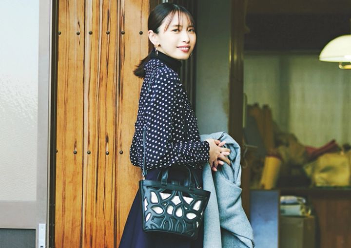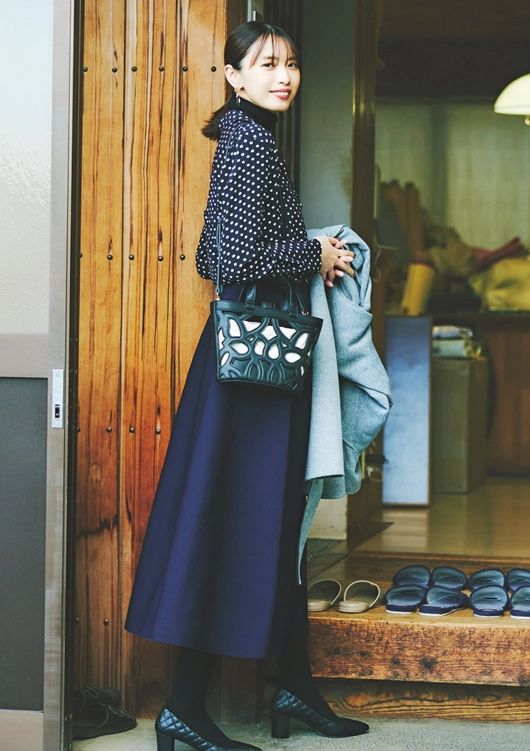 ウールコート¥29,000、ニットセットアップ スカート¥11,000/ともにPLST、タートルニット¥2,990、リブタイツ¥1,500/ともにUNIQLO、水玉ブラウス¥6,590、カットワークバッグ¥5,990/ともにZARA(ザラ)、キルティングパンプス¥18,700/ダイアナ(ダイアナ 銀座本店)、フープピアス¥1,760/スリーフォータイム(ジオン商事)
