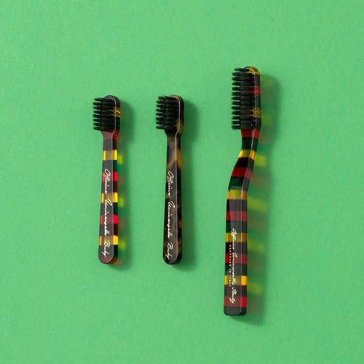 他では見ないスタイリッシュなボディの歯ブラシ。抗菌作用があるとして昔から使われている植物性炭をしみ込ませたブラシが口内の衛生バランスを整えます。〈左〉オフィシーヌ・ユニヴェルセル・ビュリー マルチカラー歯ブラシ ミニ¥5,940〈中〉ミニブロス・ア・ダン チャコール(ヴェール)¥5,610〈右〉マルチカラー歯ブラシ¥6,600