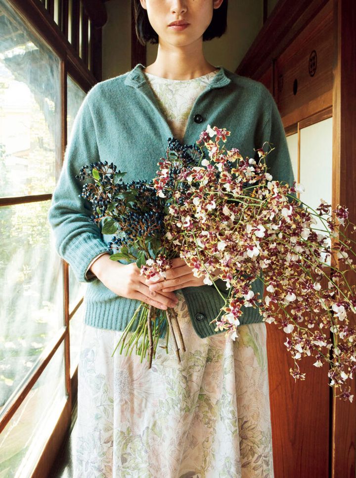 『ル・ベスベ』の松岡龍守さんが選んでくれた今月の花は、枝垂れる姿が優美な蘭、オンシジューム シャリーベイビー。「ブラウンパープルの花は蝶々が舞っているようで可憐でしょう? 蘭の中でもここまで繊細な品種は珍しいと思います。茎がとても細く、自然にしなって流れをつくってくれるので、さっと生けるだけで様になる。ほのかに甘い香りも花らしく、飾りやすい品種です」。一緒に束ねたのは、濃紺の実が艶っぽいビバーナム ティヌス。リースにも使われる枝ものと組み合わせて、冬らしいブーケに仕立てた。(ル・ベスべ 03−5469−5438)カーディガン¥47,300(マーガレット・ハウエル 03−5785−6445)ワンピース¥39,600(ヤエカ ライト/ヤエカ 03−6426−7107)その他スタイリスト私物
