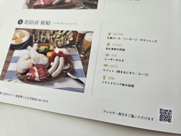 今回は「レギュラー メニュー」(7,000円/1人)を予約していました。牛肩ロースステーキやチキンレッグ、サラダとグリル用野菜、〆のリゾット、ソフトドリンク飲み放題のセットです。国産牛ステーキを楽しめる「プレミアム メニュー」(9,000円/1人)があります。