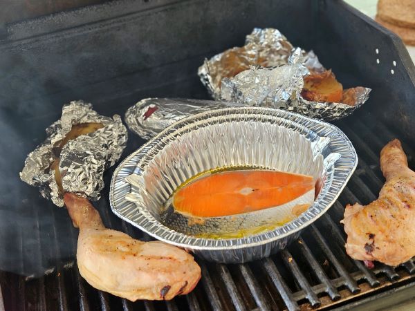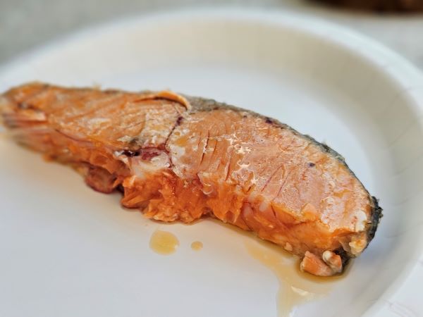 サーモンステーキは、アルミ皿とオリーブオイルポーションがセットになっています。