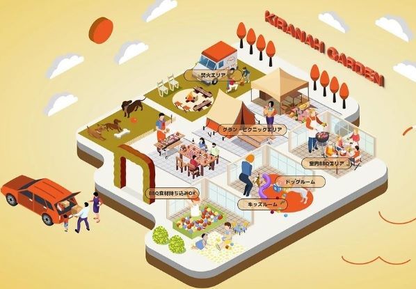 【キラナガーデン豊洲】 https://www.kiranahresort-toyosu.com/ 東京都江東区豊洲6-5-27 ゆりかもめ線 市場前駅から徒歩10分 03-6910-1818 ※併設駐車場あり(施設利用による駐車サービスなし) 「駐車料金」 平日(24 時間最大 1,500 円) ・8:00~22:00 30 分 /200 円 ・22:00~8:00 60 分 /200 円 土日祝(最大料金なし) ・8:00~22:00 30 分 /500 円 ・22:00~8:00 60 分 /200 円 ※「室内BBQ」予約専用サイトあり。公式HPより予約サイトへ進めます。