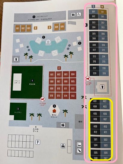 施設紹介の地図で見ると、ピンク色で囲った場所が「室内BBQ」のエリアです。その内、黄色の部分は「ペット同伴」で室内BBQができるエリアです。