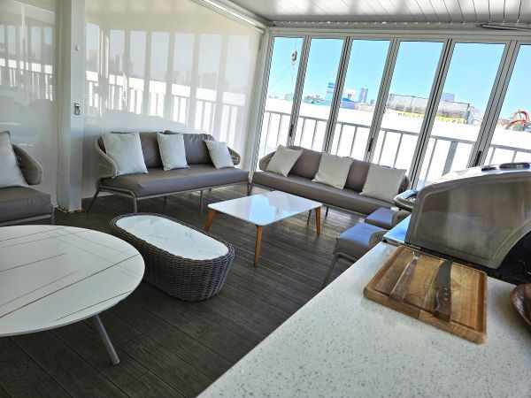 室内BBQの様子です。冷暖房完備の快適室内で、ソファに座ってラグジュアリーに、高級グリルで最高のBBQを楽しめます。