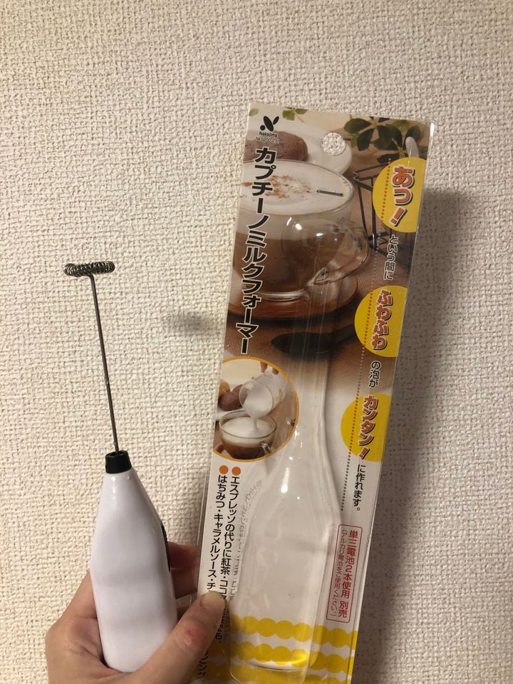 という時に思い出しました、この子の存在を!100円ショップで手に入る簡単に泡立てる機械。ものの30秒ほどでクリーミーな泡が出て自宅でカフェラテ気分を味わえるこの子。カプチーノミルクフォーマー。