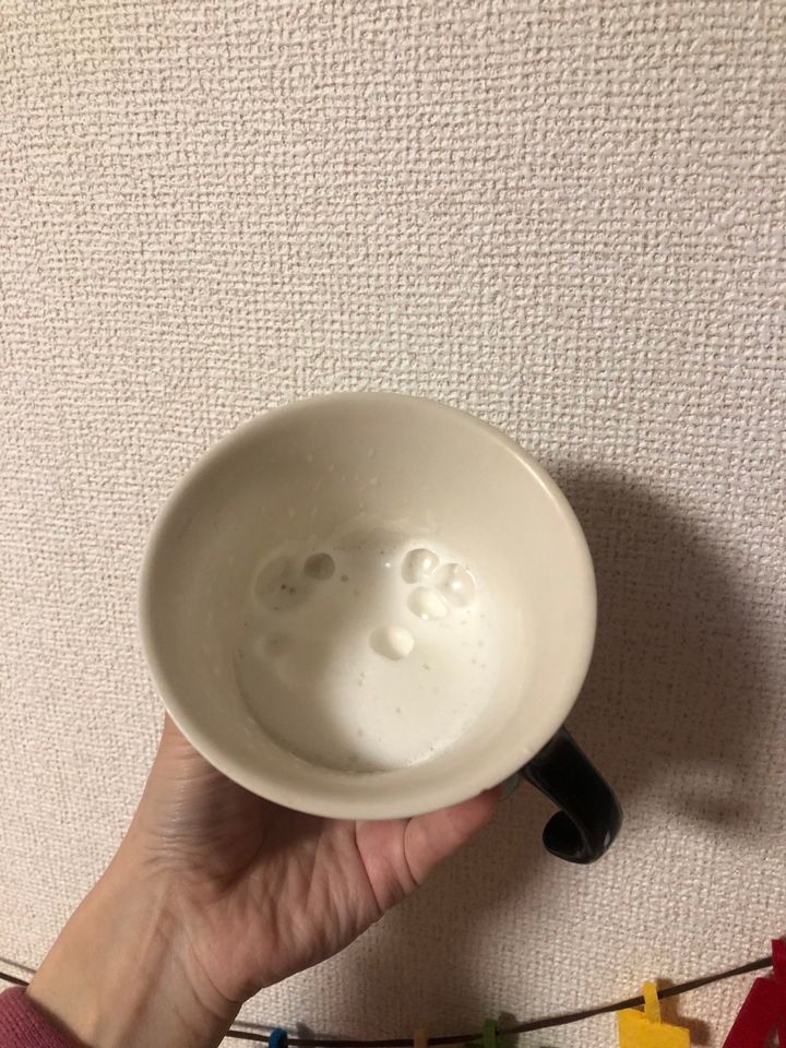 日の目を見た1台目はしまってあった期間が長かったからか、すぐに壊れてしまいまして。2台目のこの子で私はマスターしました。ミルクを多めに入れてちゃんとミルクの中で泡立てれば、こんなにもモクモクと雲のように泡立つのだと…(笑)。ボタンひとつで高速回転する上の丸いドーナツのようなところ。そして、私の手も振動でブルブルと震えますが、なんとクリーミーな泡!