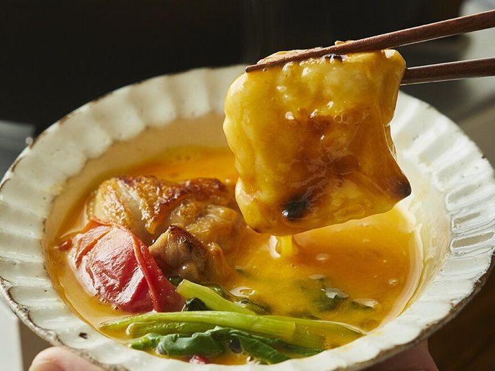 玉ねぎは縦半分に切り、縦に幅5㎜に切る。小松菜は根元を切り、長さ5㎝に切る。トマトはへたを取り、6等分のくし形に切る。鶏肉は筋と余分な脂肪を除き、一口大に切る。餅はオーブントースター(1000W)で、両面にこんがりと焼き色がつくまで4~5分焼く。