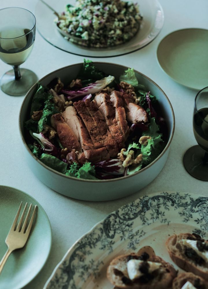 鶏肉は皮目をじっくり焼き、香ばしく仕上げると◎。ほろ苦いトレビスと口当たりのいいくるみも加え、大人味に。