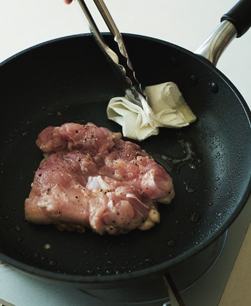フライパンにオリーブ油を弱めの中火で熱し、鶏肉を皮目を下にして入れる。ときどきトングなどで上からおさえ、出てきた脂をペーパータオルで除きながら、こんがりと色づくまで10分ほど焼く。上下を返し、弱火にして5分ほど焼く。