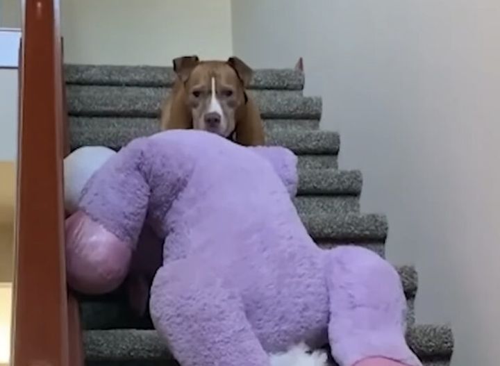 3. 人間と同じくらいの大きさ! ビッグサイズのぬいぐるみを、2階に連れていきたくて頑張る犬さん。