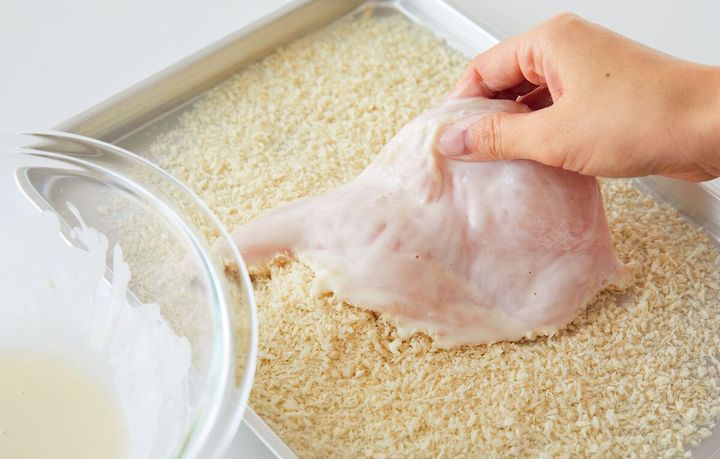 鶏胸肉は加熱して繊維が縮むとパサつきの原因に。手でたたいて繊維をこわしておくと加熱しても柔らかく、食べやすくなります。また薄くのばすことで火の通りもよくなり、調理時間が短縮できます。