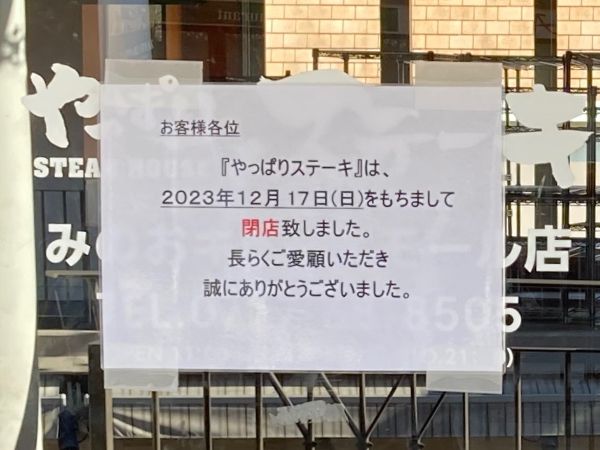 【閉店】箕面「やっぱりステーキ みのおキューズモール店」 2023年12月17日(日)閉店