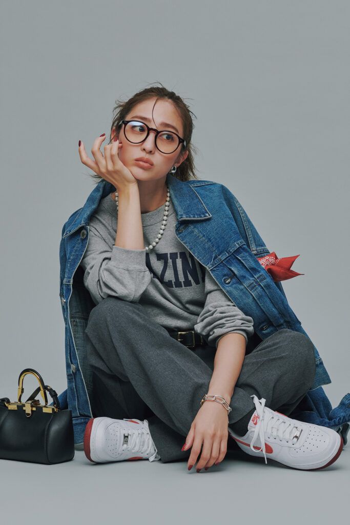 Gジャン¥50,600(ハイク/ボウルズ)ロンT¥17,600(THIRD MAGAZINE)パンツ¥23,100 ポケットに入れたスカーフ¥7,150(ともにザシンゾーン/シンゾーンルミネ有楽町店)ベルト¥41,800(カルメイヤー/アパルトモン神戸店)バッグ¥148,500(ザンケッティ/エリオポール代官山)スニーカー¥16,170(ナイキスポーツウェア/NIKE カスタマーサービス)メガネ¥42,900(モスコット/モスコットトウキョウ)イヤリング¥5,250(アビステ)ネックレス¥12,100 (ルル・ウィルビー/アルアバイル)ブレスレット¥11,000(インムード/フォーティーンショールーム)靴下/スタイリスト私物