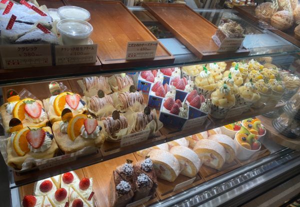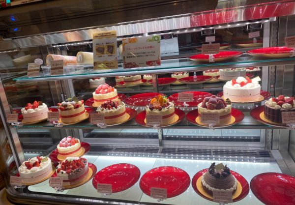 ショーケースにずらりと並んだケーキ、ホールケーキはどれも美味しそう!