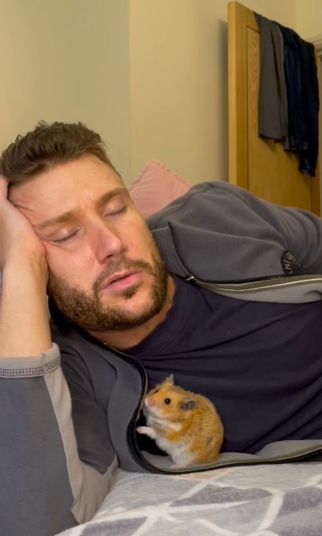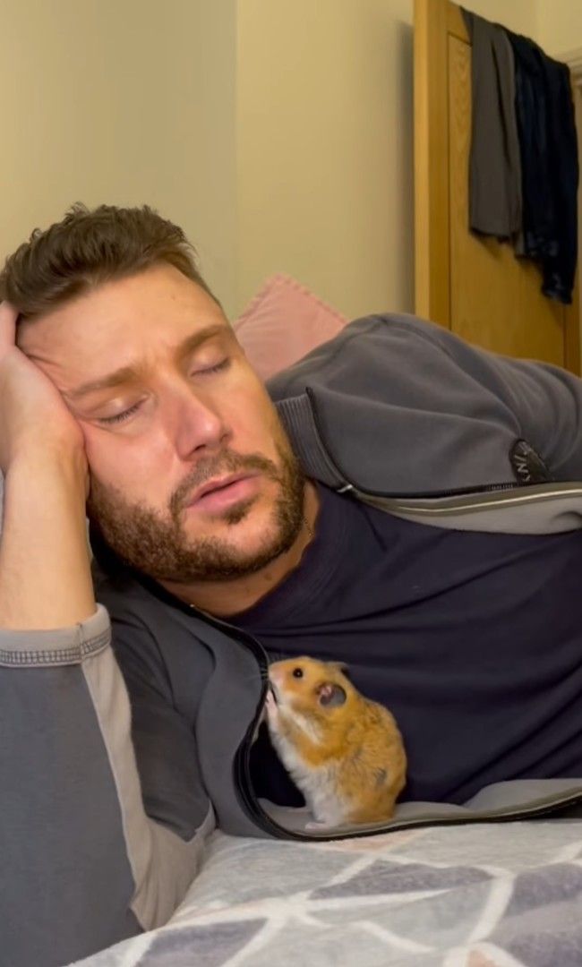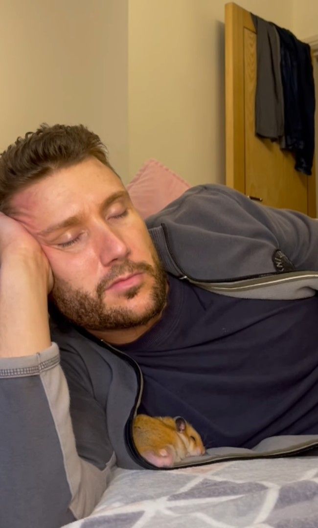 頬杖をついて眠っている男性にくっついているハムスター。 この子は飼い主さんのことが大好きなようで、くっついて離れないどころかそのまま一緒に寝始めてしまいましたよ!!