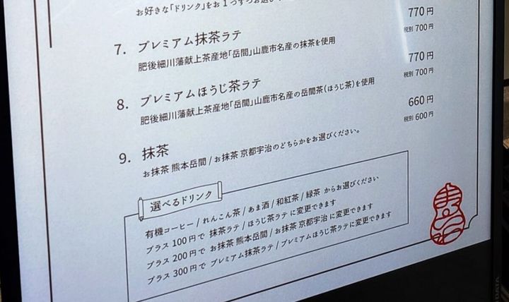 セットのドリンクは「有機コーヒー・れんこん茶・あま酒・和紅茶・緑茶」から選べ、追加100円で「抹茶ラテ・ほうじ茶ラテ」、追加200円で「熊本岳間・京都宇治」、追加300円で「プレミアム抹茶ラテ・プレミアムほうじ茶ラテ」にも変更OK。
