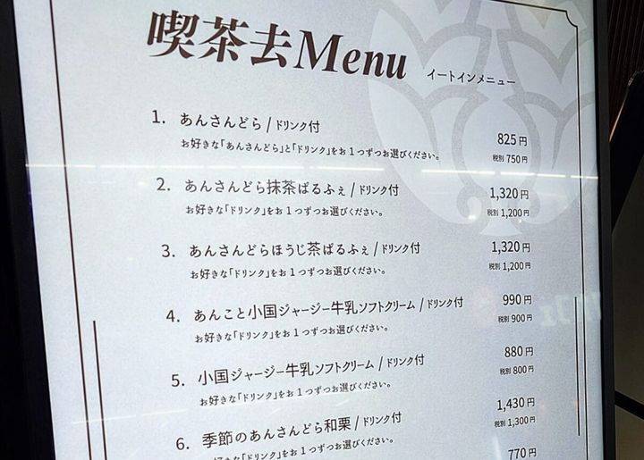 イートインは、看板商品の「あんさんどら」、抹茶とほうじ茶の2種類ある「あんさんどらぱるふぇ」、「あんこと小国ジャージー牛乳ソフトクリーム」、「小国ジャージー牛乳ソフトクリーム」(税込825円〜)とあり、単品はなく、ドリンクセットでいただけます。