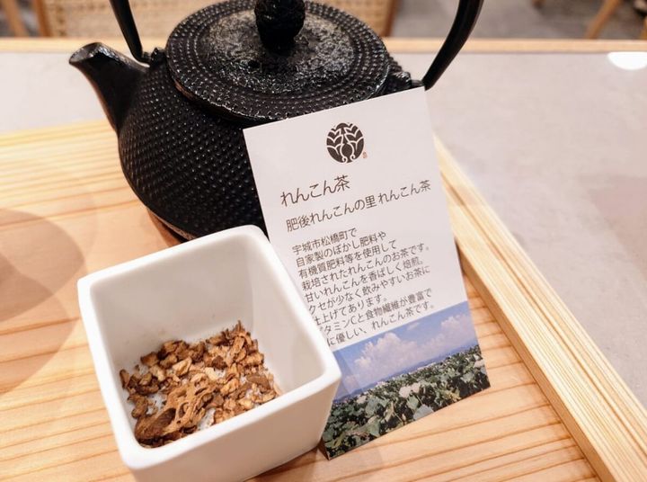 一度味わってほしい、肥後れんこんの里の「れんこん茶」。ビタミンCと食物繊維が豊富なれんこんを焙煎し砕いたお茶は、香ばしくて、れんこんがふわっと香り、想像以上に飲みやすい健康茶でした。