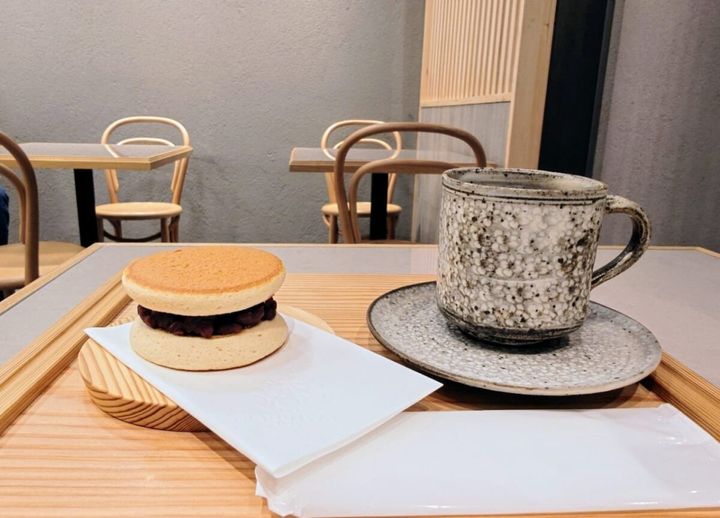 好きな「あんさんどら」と「ドリンク」を1つずつ選べるイートインの「あんさんどら/ドリンク付」(税込825円)。木のトレーに凛としたオーラを放つセット。ペーパーナプキンに挟んで手に持っていただきます。