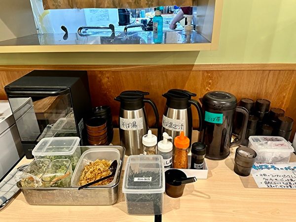 返却口横には無料トッピングコーナーがあります。 ・冷そばつゆ ・温そば出汁 ・そば湯 ・冷そば茶 ・青ネギ ・天かす(グルテンフリー) ・生姜 ・生わさび ・刻み海苔 ・七味 ・ごま ・かえし醤油 ・土佐醤油