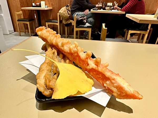 小麦粉不使用グルテンフリー、そば粉で揚げた黄金色の天ぷらです。揚げたて、サクサクです。