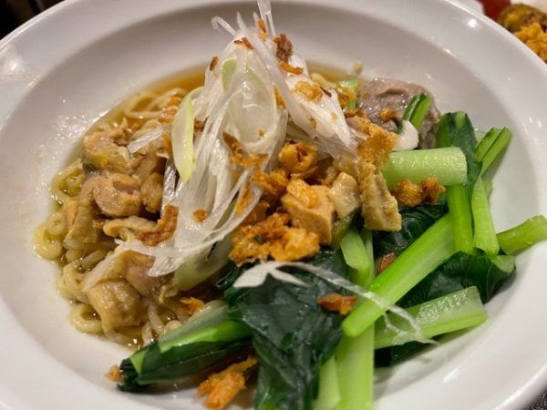 定番の鶏そば(Mie Ayam) 2皿目はミーアヤムという鶏そば。鶏の旨味が効いていてとてもおいしく、お好みで辛みを入れていただきます。