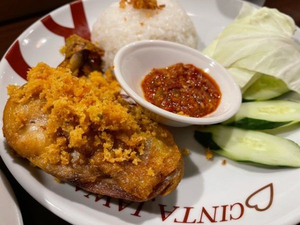 チキンクリスピープレート(Ayam Kremes) カリカリに揚げられた鶏肉にスパイス(サンバル)をつけていただきます。味は現地のままでとてもおいしくて、毎回頼んでしまいます。