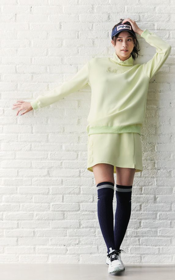 〈モデル〉トップス¥14,300、スカート¥13,200、サンバイザー¥3,850、ニーハイソックス¥2,640、シューズ¥14,300(以上ピンアパレル/ピンアパレルお客様相談室)