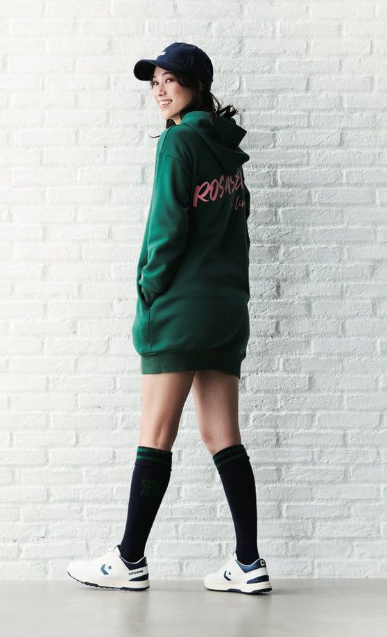 一枚でおしゃれを完結させたいなら、迷わずフーディワンピースを選びたい。ラフなシルエットがストリート系のスタイルを実現し、ピンクのバックプリントがパンチを利かせています。ロゴ使いがおしゃれなロサーセンは、今季、レタードニットも充実しています。