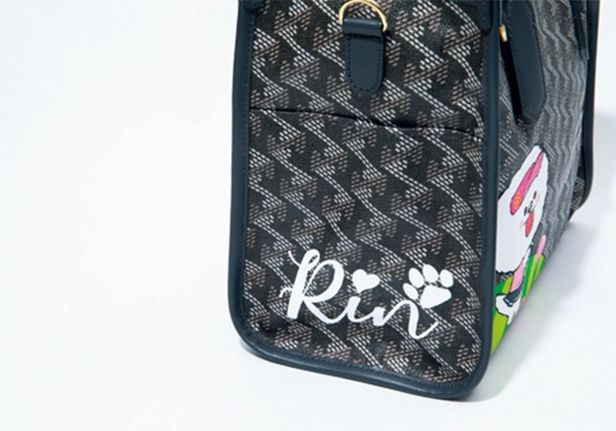 黒&グレーのバッグにイラストが引き立つよう、ぱんちゃんが着る服を華やかなピンクやマスターズのキャディさんと同じグリーンにするなど、こだわりを凝縮。さらにサイドにはたくさんのフォントの中から選んだ英字で名前をIN!