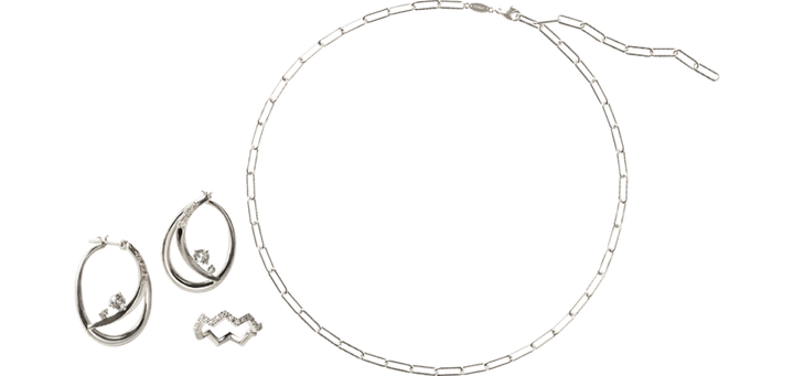 シャイニーなメイク&トップスとトーンを合わせて、ジュエリーもシルバーをチョイス。「耳元はダイヤモンドをあしらった繊細なデザインのピアスとイヤーカフで優美なエッセンスをひとさじ。一方で、襟元にあえてラフなチェーンネックレスを飾る“ハズし”で大人のセンスを見せつけて」(古田さん)