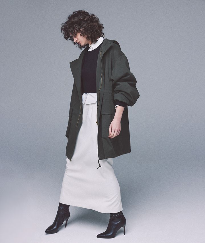 今季一番の寒さだった今日から、少しだけあたたかさが回復する明日。軽やかなムードを出せる白スカートを選んで、でもコンサバにまとまらない無骨なカーキのコートが味方に。