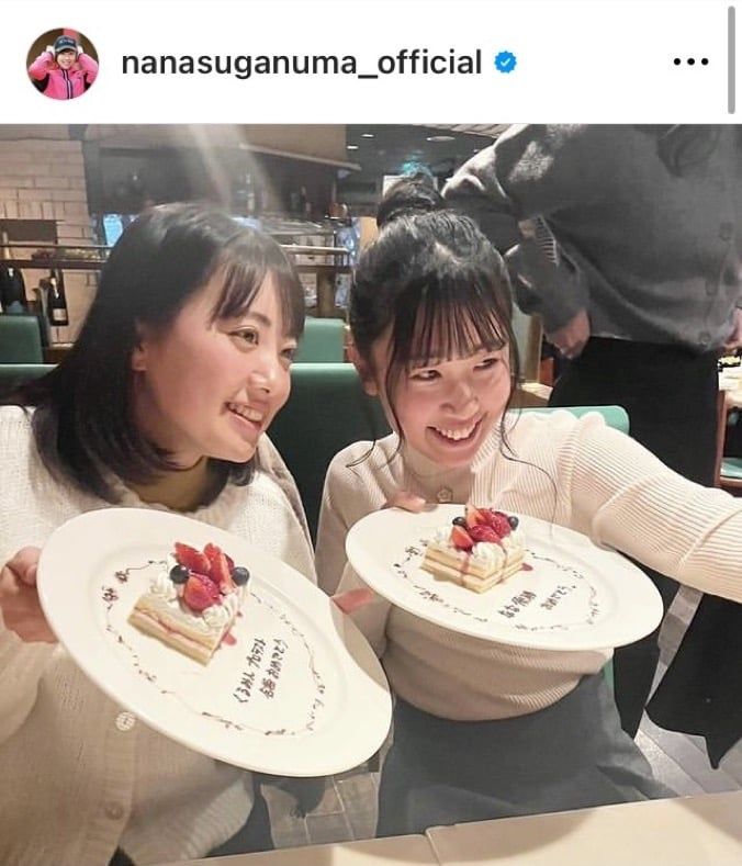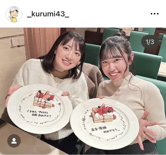 「全員じゃなかったから次は全員で会おうね。優勝のお祝いケーキありがとう」との写真には「なな優勝おめでとう」「くるみんプロテスト合格おめでとう」というお祝いのケーキを手にする2人の姿が写っています。
