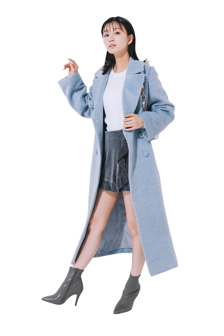 グレーロングコート 28,600円/WILLSELECTION ルミネエスト新宿店 白ニット 8,980円、グレーベロアフリルスカパン 8,980円/ともにépine 白バッグ 12,900円/チャールズ&キース(チャールズ&キース ジャパン) グレージュブーツ 10,890円/RANDA