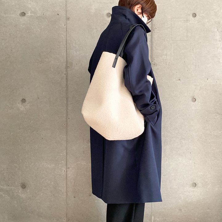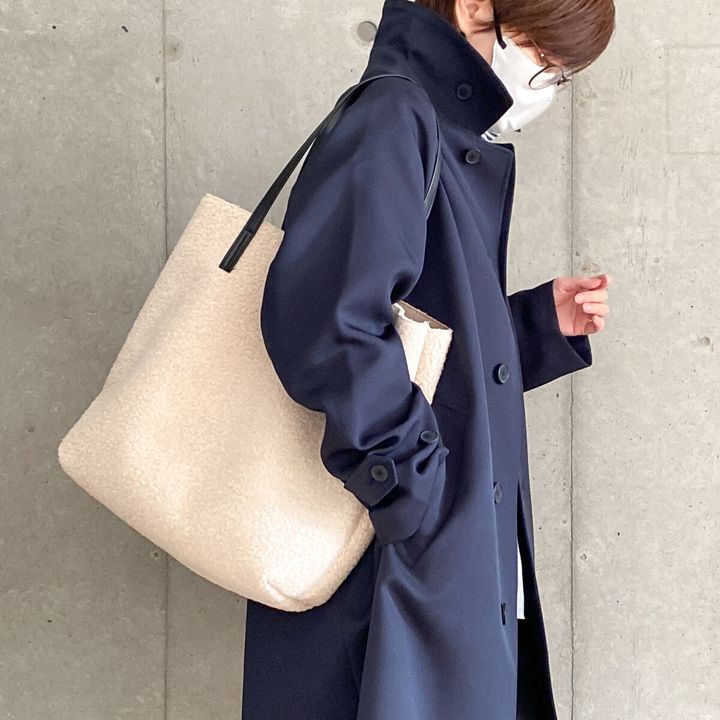 冷たく見えがちなホワイトのバッグ。冬素材のボアならあたたかそうに見えるのでおすすめです。手触りもよくてほっこりした質感です。バッグなら手に持つだけ!トートバッグで取り入れると面積が大きいのでより明るいコーデになりますよ。