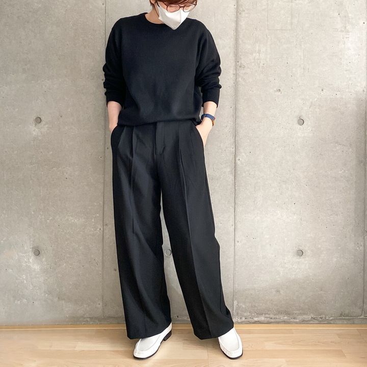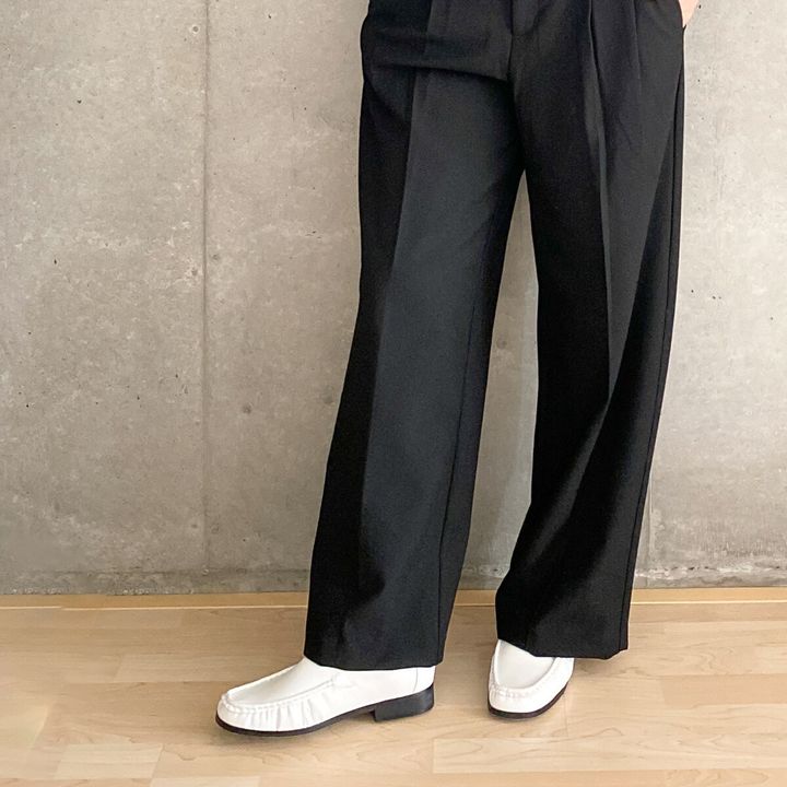 今トレンドのワイドパンツに合わせてもOK。ローファーはかっちりとしたイメージですが、ホワイトの明るい色を選ぶことで重くなりがちな足元が軽やかな雰囲気になりますよ。