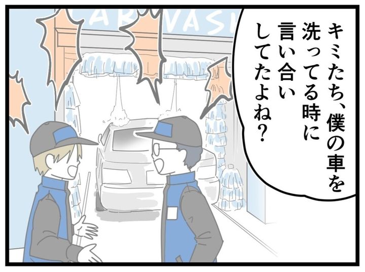 客は事故だけでなく、その前の2人の衝突から見ていたのですね。自身の車が傷ついたことはさておき、冷静に事を見極め、何がいけないか言い切った客にあっぱれです。副店長の話し合いの現場が「すごかった」というリアクションに納得ですね。