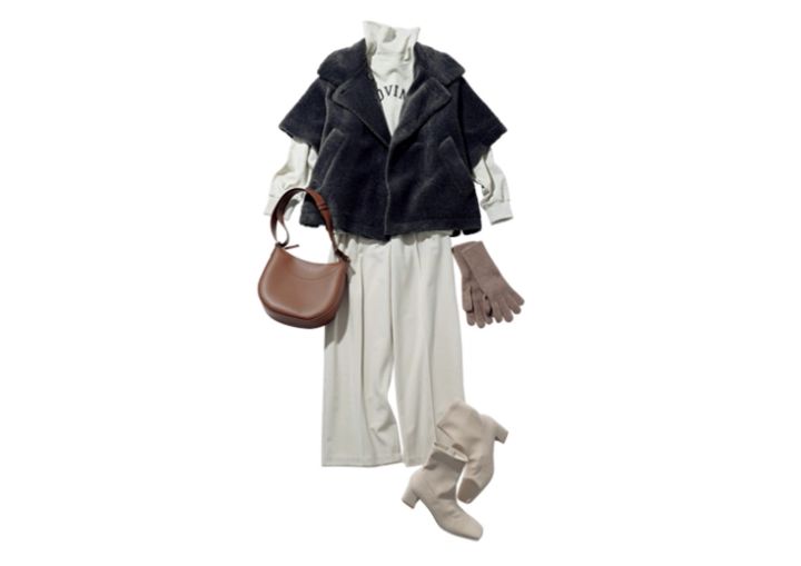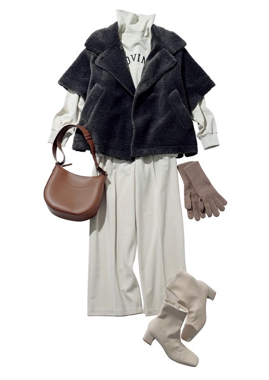 エコファーケープ¥20,900/ココ ディール、ハイネックスウェット¥2,790/アメリカンホリック、ショルダーバッグ¥2,990/UNIQLO、白パンツ¥2,490、ショートブーツ¥3,990、手袋¥1,490/以上GU