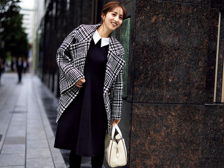 モノトーンの日は華やかな千鳥柄コートを主役に。ワンピの白襟できちんと感もしっかりキープ。