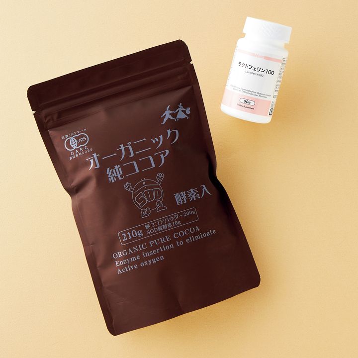 左:アーモンドミルクで割って間食代わりに。オーガニック純ココア酵素入[210g]¥1,360(イーシーアイ)右:生きたまま腸へ届く有胞子性乳酸菌配合。ラクトフェリン 100[90粒]¥7,344(オプティマムヘルス)※メディカルメンバー限定サプリ
