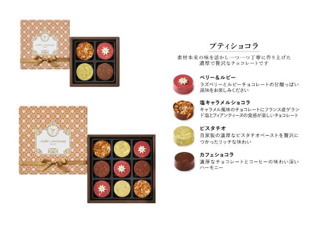 アトリエ アニバーサリーの2024年バレンタイン・ホワイトデーのテーマは、「melange(メランジ)」。フランス語で「混合する」という意味です。甘さとしょっぱさ、なめらかさとザクザク感、可愛らしさと大人っぽさなど、異なる要素を入れこんでいます。