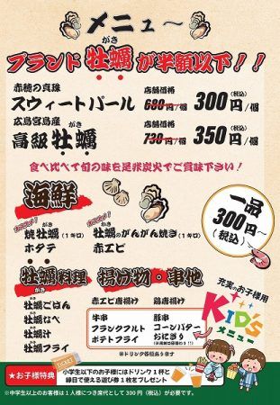 同公園で“牡蠣小屋”が開かれるのは初の試み。兵庫県赤穂産の真珠スウィートパール(1個300円)や広島県宮島産の牡蠣(1個350円)のほか、ホタテ、赤エビなどが炭火焼きで堪能できます。牡蠣ごはん、牡蠣なべ、牡蠣汁、牡蠣フライ、赤エビ唐揚げ、鶏唐揚げなどの一品(300円~)も用意されています。また、フランクフルトやポテトフライ、おにぎりなど、キッズメニューも用意。キッズスペースや子ども向け縁日も毎日開催され、子ども連れでも楽しめそうです。
