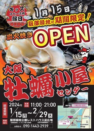 「大阪牡蠣小屋センター」 出店場所:服部緑地レストハウス前広場 営業期間:2024年1月15日(月)~2月29日(木) 営業時間:11:00~21:00 ※1人300円の席代が必要(小学生以下無料) ※生牡蠣はありません。提供する牡蠣は全て加熱用です ※混雑時は時間制限を設ける場合があります https://bbq-takuhai.net/kakigoya_hattori/ ※チラシ画像は提供画像