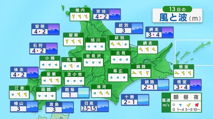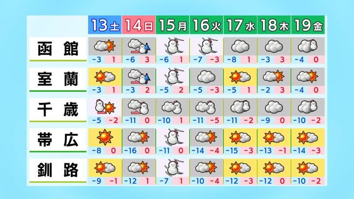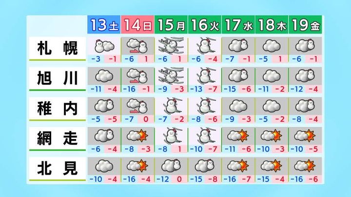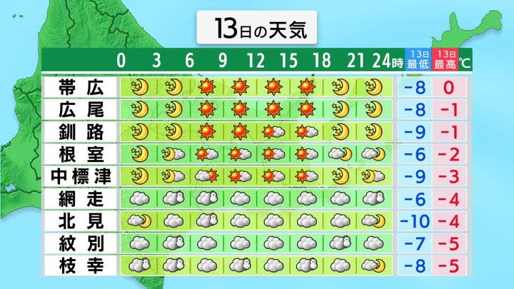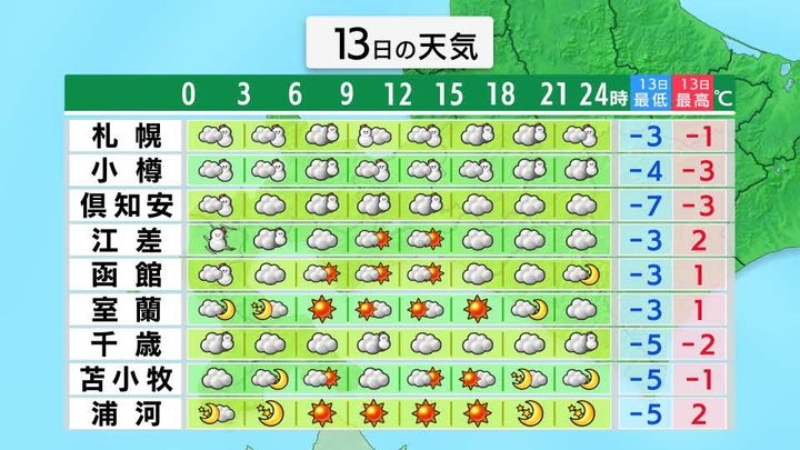 13日(土)朝の最低気温は、-5度前後のところが多く、12日(金)の朝より3度ほど低くなるでしょう。日中の最高気温は、道南方面で1度くらいのほかは、全般に-3度前後で、札幌は-1度の見込みです。日中でもツルツル路面に気を付けて下さい。