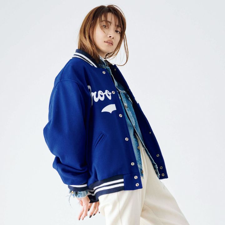 スタジャン¥107,800(セトルマイヤーズ/ロク シンジュク)、タートルネックニット¥20,900(イロット/ザ・ウォール ショールーム)、デニムジャケット¥74,800(マディソンブルー)、パンツ¥69,300(フォルテ フォルテ/コロネット)、シューズ¥260,700(ジミー チュウ)