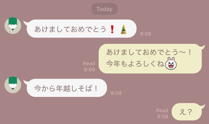 「年があけて数時間経ったタイミングで彼から『あけましておめでとう!今から年越しそば!』とLINEが届いて、思わず笑ってしまいました。後から聞いたら、遊びに行っていて買っていた年越しそばを食べそびれたらしく、早く消費しなくちゃ!って慌てていたらしいです(苦笑)。“あけおめ”と“年越しそば”っていう単語が並んでいる異様さに、じわってしまって、ひとりでいつまでも笑ってました」(26歳女性/金融関係)