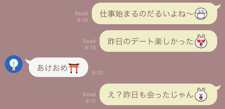 「元カレはたまにイミフなLINEをしてくる人で、お正月のあけおめLINEに、あけおめの挨拶と共に、まったくおめでたくないスタンプが届いたことがあります(苦笑)。お正月なのに、妙にダークな感じで…。間違えて送ったのか、それともウケを狙って送ったのかはわかりませんけれど、変に突っ込む気にもなれなくて、そのままスルーしちゃいました。よくわからないコミュニケーションをする人だな〜と思ったので、すごく印象に残っています」(25歳女性/ネイリスト)